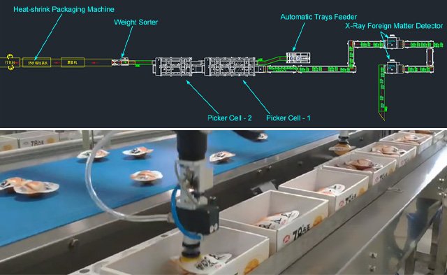 Our customer, a famous food manufacturer in China, needed a automated transit packaging solution to Increase productivity. The customer expects to load 24000 objects to trays per hour, all processes are automated, including trays feeding, X-ray inspection, tray loading, weight sorting, film wrapping.